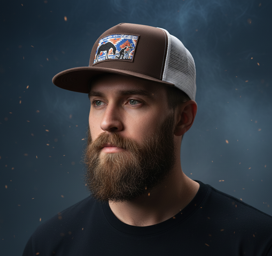 A bold statement with a rustic look - the Aztec Cowboy Cross Flatbill Hat embodies classic style with an untamed edge. Featuring a striking embroidered Aztec patch with a cowboy and cross graphic, it's a bold statement for those who are unafraid of what they believe in. The sleek flatbill design and classic fit ensure a modern, clean look that's perfect for any occasion.