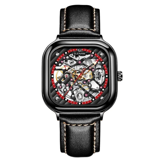 - Square Skeleton Dial with Exposed Mechanics