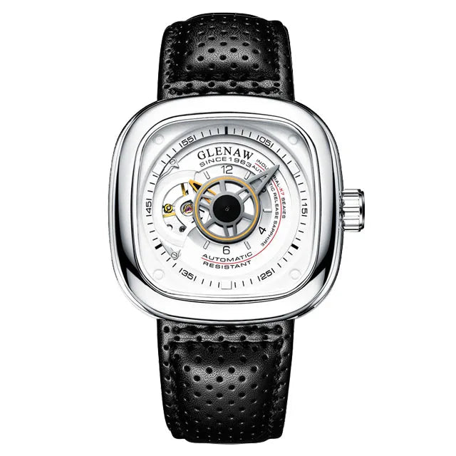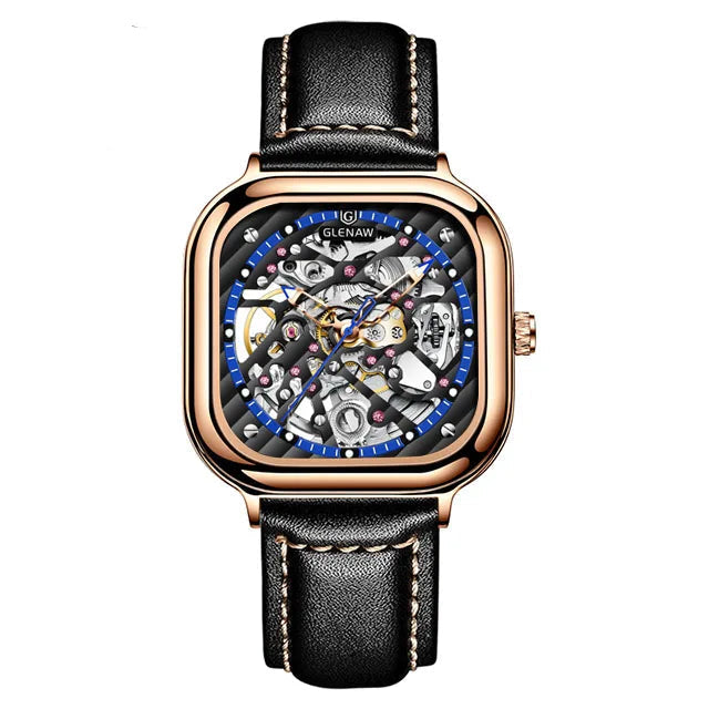 Crafted for those who embrace bold design and precision, the Skelly Apex is a true fusion of artistry and innovation. Featuring a square skeleton dial with intricate mechanical detailing, this timepiece reveals the beauty of its inner workings. The refined case and premium leather strap create a striking contrast, while the automatic movement ensures lasting accuracy without the need for batteries.