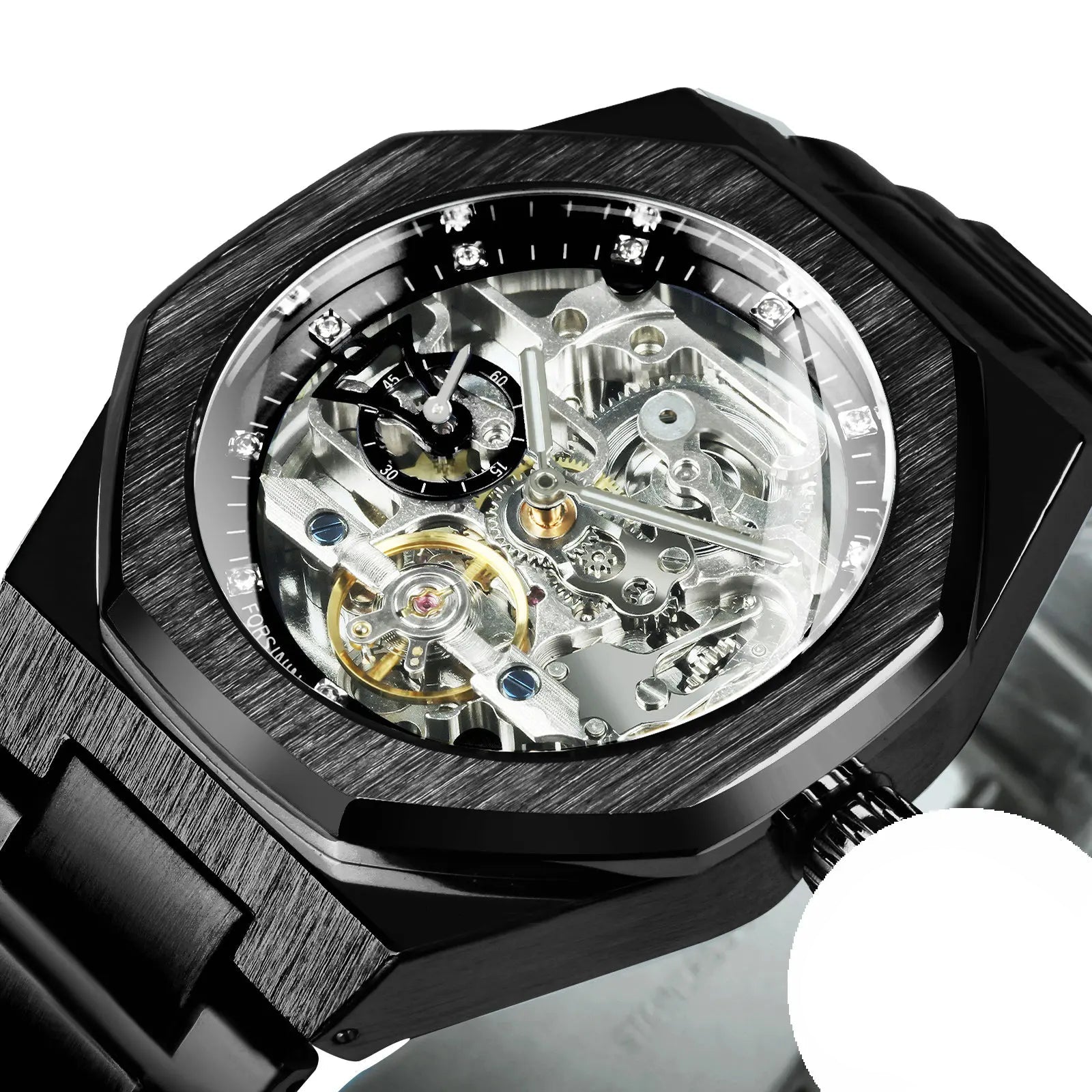 Forged for those who command presence, the Skelly Obsidian Watch is a masterpiece of luxury and precision. Its octagonal skeleton dial reveals the intricate mechanical movement, blending bold aesthetics with expert craftsmanship. The brushed stainless steel case and bracelet provide a sleek, modern edge, while the diamond-accented indices elevate its elegance.