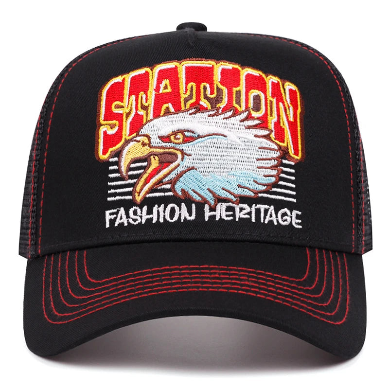 Make a statement with the Station Eagle Trucker Hat, built for those who respect heritage and wear it with confidence. Featuring a detailed embroidered eagle design with bold lettering on the front, this hat delivers a powerful, vintage-inspired look. The classic trucker mesh back provides breathable comfort, while contrast stitching adds a rugged edge that stands out from the rest. Strong, fearless, and built to last—this is a hat that speaks for itself.