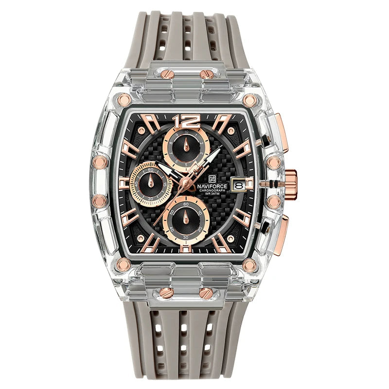 Designed for those who move with confidence, the Titan Reverb blends modern sophistication with high-performance engineering. Its crystal-clear case delivers a futuristic edge, while the chronograph dials radiate prestige and precision. Built for durability yet exuding luxury, this timepiece features a reinforced silicone strap, ensuring all-day comfort and resilience.